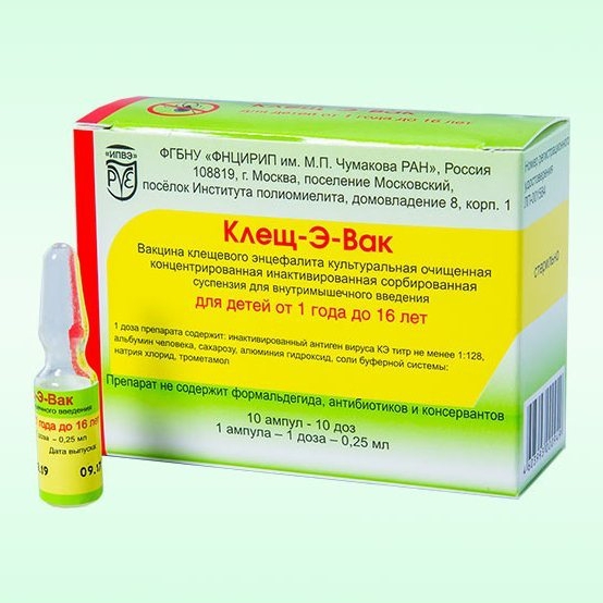 Вакцина “Клещ-Э-вак” ставится детям от 1 года и взрослым. На данный момент (апрель 2018), это единственная вакцина для детей до 3 лет, доступная в Санкт-Петербурге. Для малышей от 3 лет по ОМС производится плановая вакцинация обычной вакциной от клещевого энцефалита российского производства (конкретного названия у неё нет).