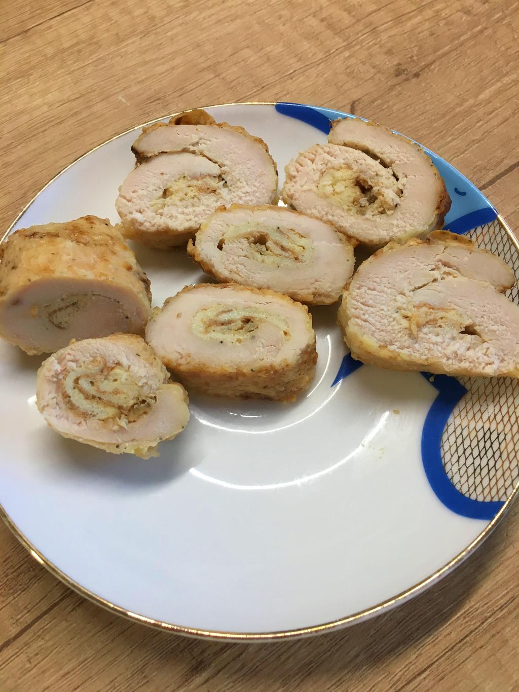 Достаем куриное филе, насыпаем на тарелочку муку для панировки и формируем рулеты: раскладываем на филе кусочки яичницы и жареный лук, закручиваем, обваливаем в муке, кладем на сковороду.